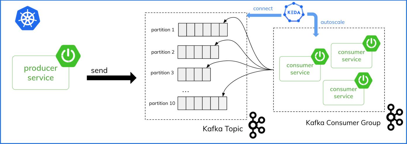 Consumer에서의 메세지 처리속도보다 Producer에서 메세지 발생량이 많을 경우, Lag가 쌓여 LagThreshold에 도달하게 되고, KEDA Trigger에 의해 Scale-out이 발생하여 각 파티션에 쌓인 Lag를 병렬로 Consuming하여 빠르게 처리할 수 있다. 또한 Rebalancing을 통해 Consumer에 Partition을 적절히 할당한다.